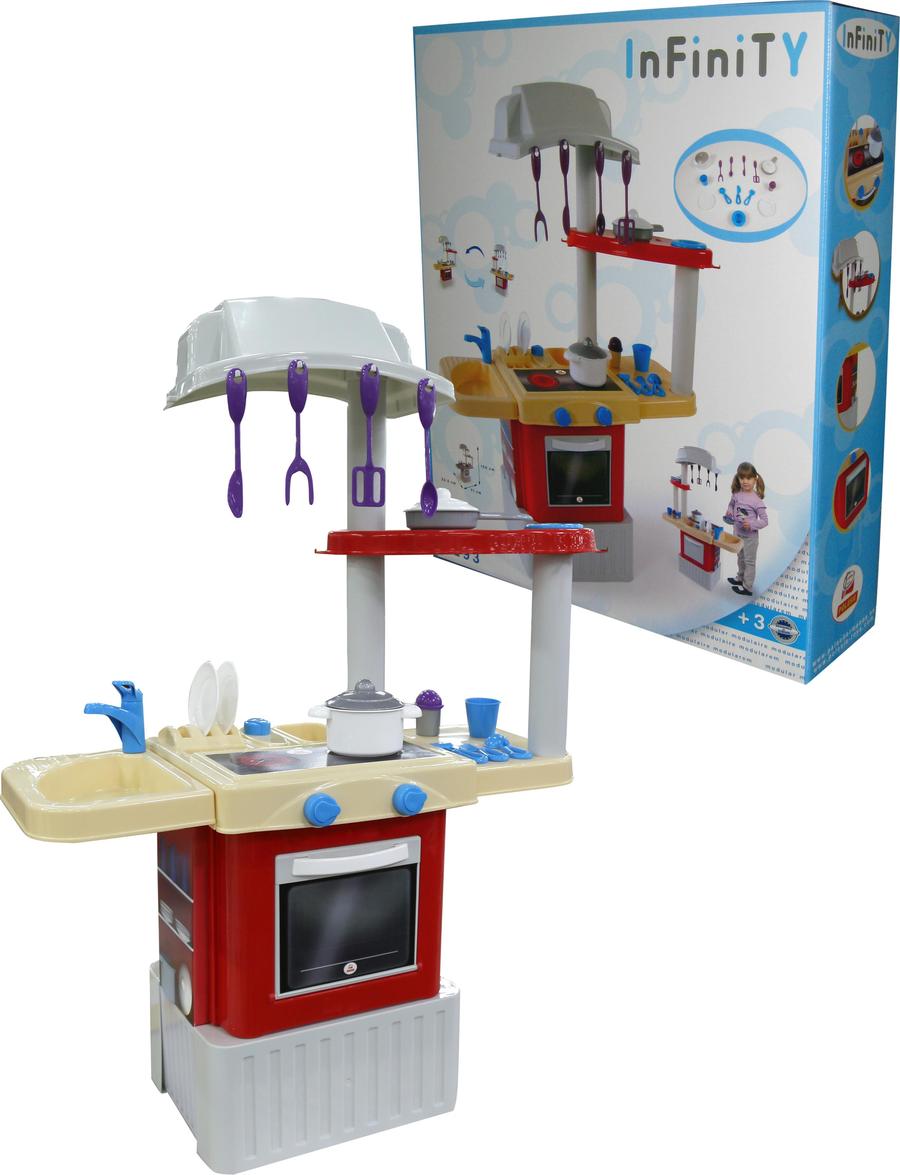 Кухня от модулната серия INFINITY оборудвана с печка, фурна, мивка, абсорбатор, съдомияла машина и шкаф за съхранение. Комплекта включва още: тиган - 1 бр., тенджера - 1 бр., чаша - 1 бр., солница 1 бр., чинийки - 2 бр., лъжица - 1 бр., виличка - 1 бр., нож - 1 бр., други кухненски уреди - 4 бр.