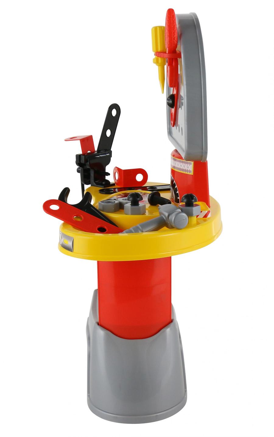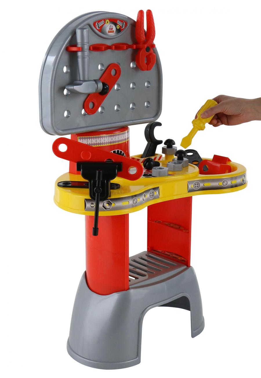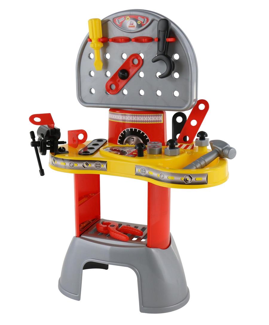 Работилницата е чудесен подарък за най-малките ентусиасти. В нея ще намерите всичко необходимо за всички видове ремонти! Специална атракция са различни инструменти, които могат да се окачват на специални държачи. На работия плот на работилницата има менгеме, което работи като истинско! Включени са и основни инструменти като: гаечен ключ, клещи, отвертка или чук. Комплектът включва и винтове, гайки и елементи, които могат да бъдат завинтени заедно.
