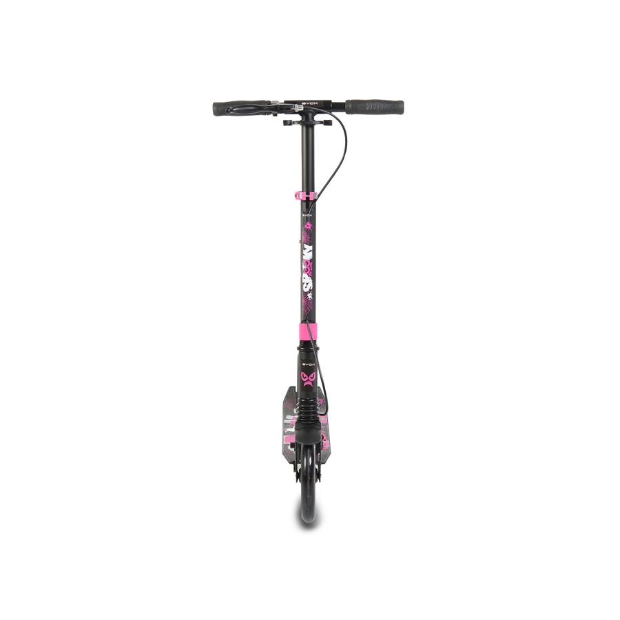 Алуминиева сгъваема тротинетка с PU колела 200*30 мм , ABEC-7 лагери; преден амортисьор; ръчна задна спирачка; странична стойка; механизъм за лесно сгъване; кормило с дължина 41 см и TPR ръкохватки ; алуминиева платформа с размер 525*110мм и покритие против хлъзгане; максимална височина на кормилото 95 см; за възраст 8 + години и максимално натоварване до 100 кг