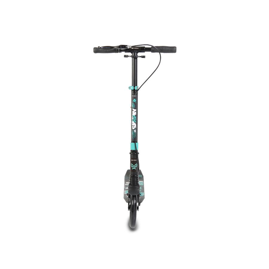 Алуминиева сгъваема тротинетка с PU колела 200*30 мм , ABEC-7 лагери; преден амортисьор; ръчна задна спирачка; странична стойка; механизъм за лесно сгъване; кормило с дължина 41 см и TPR ръкохватки ; алуминиева платформа с размер 525*110мм и покритие против хлъзгане; максимална височина на кормилото 95 см; за възраст 8 + години и максимално натоварване до 100 кг
