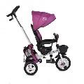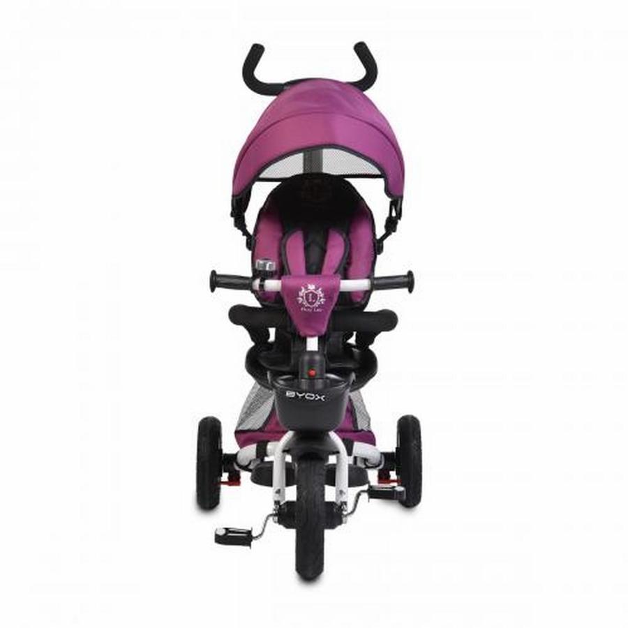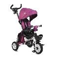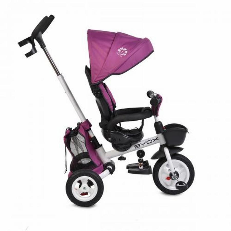 За деца от 1 година и половина до 5 години с максимално тегло до 25 кг. Може да се използва като: триколка с дръжка за родителски контрол или моторче с педали. Сгъваема задна рамка; Седалка: въртяща се на 360°; регулируема облегалка за гръбчето. Дръжка - регулируема, насочваща посоката на движение на предното колело. Гуми: каучук ненадуваем. Предно колело с бутон за свободно движение. Мек предпазен борд. Мека сваляема подложка за седалката. Пет-точкови предпазни колани. Две задни спирачки. Звънец. Поставка за чаши/ шишета. Чанта и предна кошничка за играчки.