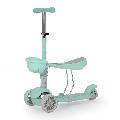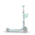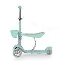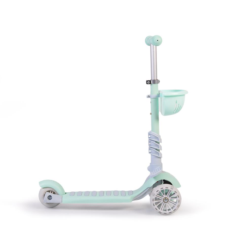 Детска тротинетка със седалка, регулируема на височина от 24см до 30см. Максимална натоварване на седлката до 20кг, а на основата до 40кг. За деца на възраст 3+ години. Предни широки колела PU120*50mm с LED, задно широко колело 90*46mm; ABEC-7 лагери . Алуминиево кормило с регулиране на височината от 68 до 78см.Предна кошница за играчки.Степенка за крачетата при функция тротинетка със седалка.