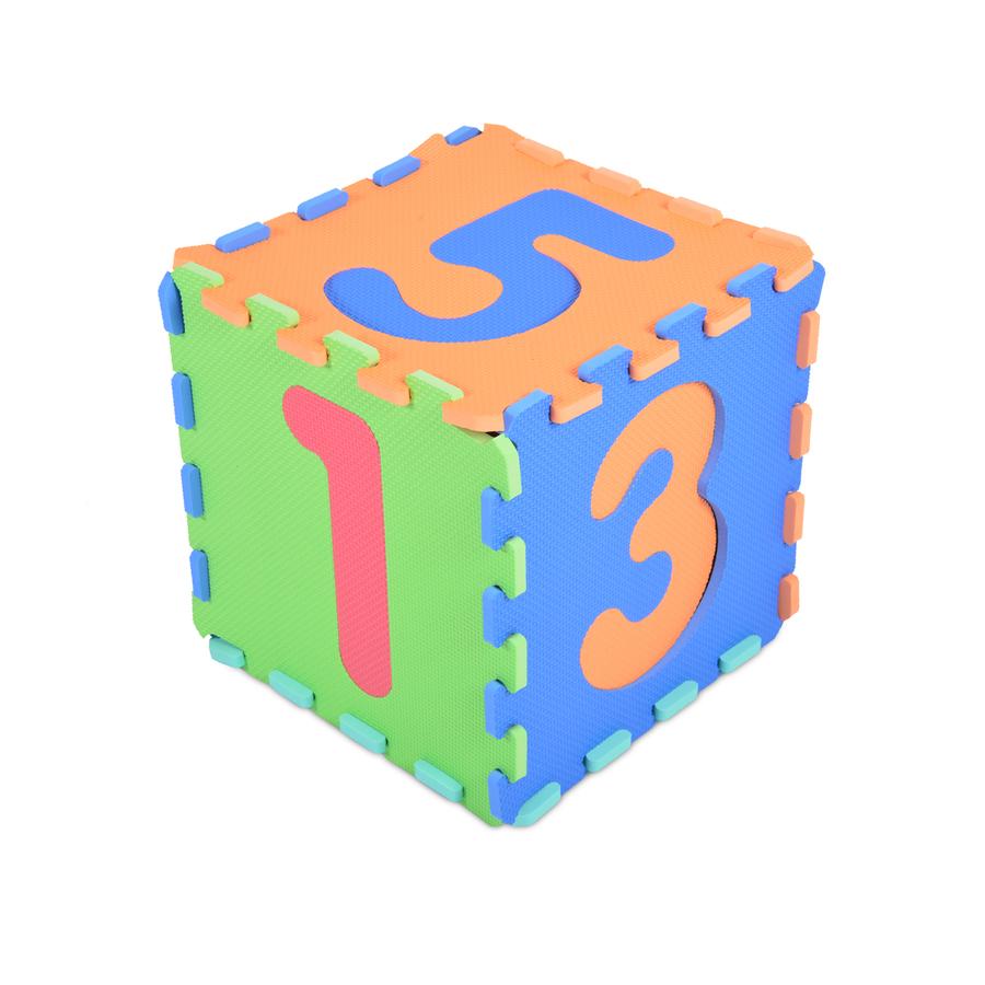 Мек пъзел с цифри / 10 елемента. Неплъзгаща повърхност. Дебелина - 10мм. Размер на единична плочка 32 х 32 см. Подпомага развитието на цветоусещането и фината двигателна моторика от съвсем ранна детска възраст. Изработен от мека еластична EVA пяна, с отлична топлоизолационна функция. Подходящ за деца над 10 месечна възраст.