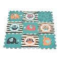 Мек пъзел Elephant & Owl - 9 елемента. Неплъзгаща повърхност. Термотрансферен принт. Дебелина 9 мм. Размер на единична плочка 31 х 31 см. Размер в сглобено състояние 89 х 89 см. Подпомага развитието на цветоусещането и фината двигателна моторика от съвсем ранна детска възраст. Изработен от мека еластична EVA пяна, с отлична топлоизолационна функция. Подходящ за деца над 10 месечна възраст.
