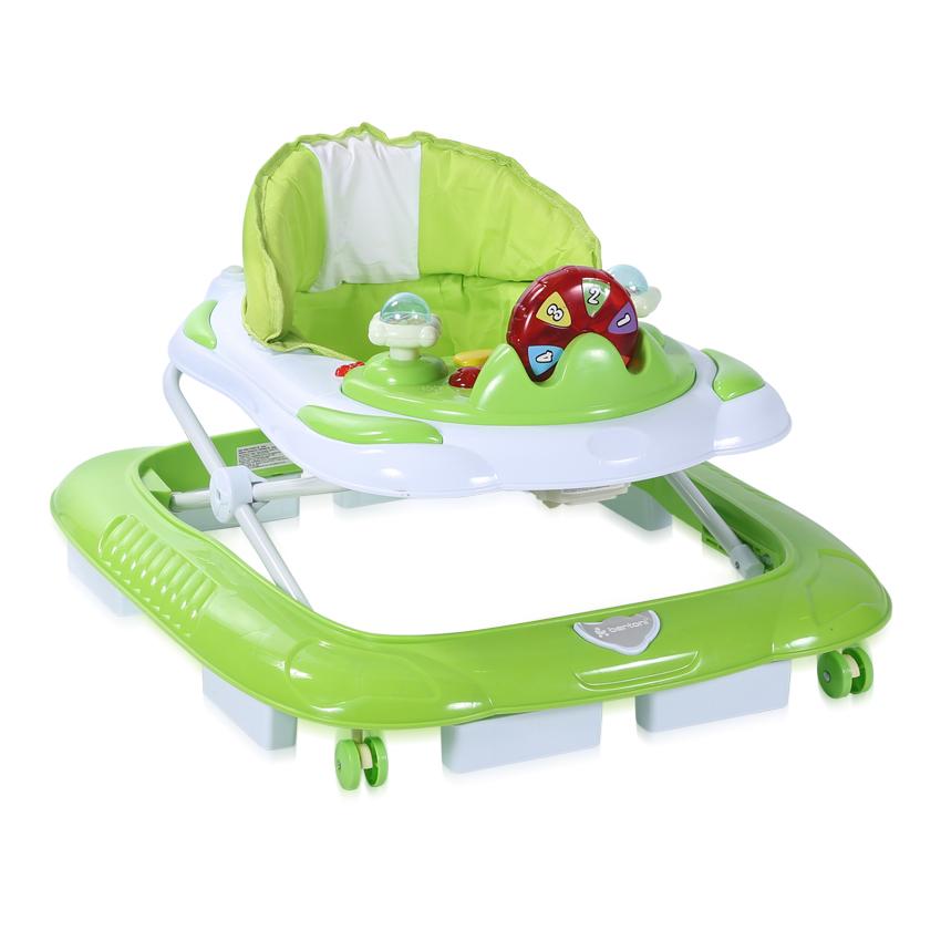 евробаза,широка основа, гарантираща безопасност и стабилност при първите стъпки на детето,регулиране височината на седалката,4 колелца, от които предните 2 се въртят на 360°,силиконови стопери против хлъзгане, за по-голяма сигурност,тегло на детето: max 12 кг,лесно сваляща се за почистване текстилна част,цветен плот със забавна форма и играчки спомагащи за развитие на детското въображение,музикален панел с 12 мелодии в комбинация със светлини /необходими са 3 броя батерии АА+, 1,5 V, които не са включени в комплекта/