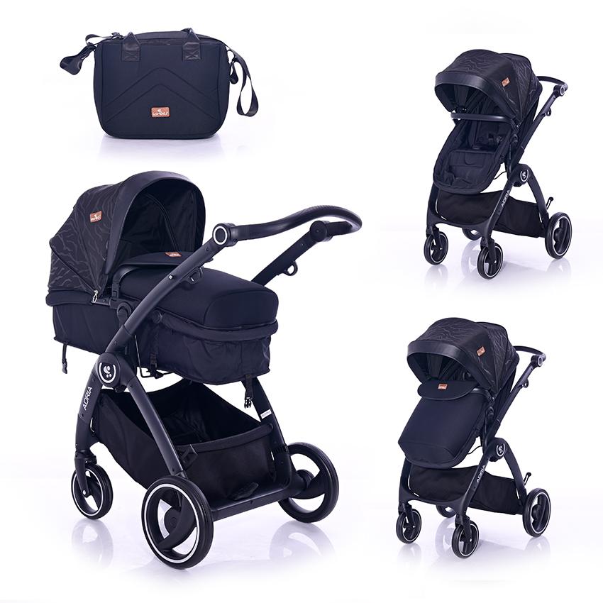чанта за аксесоари,отстраняем гриф,сгъваем сенник с допълнителна секция,еко кожен протектор,регулиране на облекалката,сенника и поставката за крачета,завиващи предни колела,кош за новородено, трансформиращ се в седалка,голям кош за пазаруване,адаптори за столче за кола,столче за кола Pluto или Lifesaver /опция/,покривало,алуминиева рама,реверсивна седалка,водоустойчив цип на сенника,регулиране на дръжката,5-точков предпазен колан