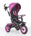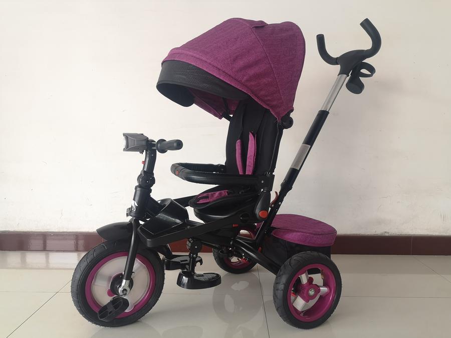 За деца на възраст от 12 до 72 месеца и с максимално тегло до 28 кг; Надуваеми гуми - предна 12 инчова, задни - 10 инчови; Предно колело с функция за фиксиране на педалите - колелото се движи свободно, а педалите са в едно положение и не могат да контролират колелото. Регулируема дръжка за родителски контрол, контролираща посоката на движение на предното колело. Регулируемо кормило; Две поставки за крачетата: за по-малки деца и сгъваема за по-големи деца. Регулируем сенник; Въртяща се на 360° седалка; Облегалка - с 2 положения на лягане; Мек предпазен борд, мека сваляема подложка седалка, пет-точкови предпазни колани, две задни спирачки и задна кошница за играчки, музикално табло със светлини.
