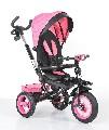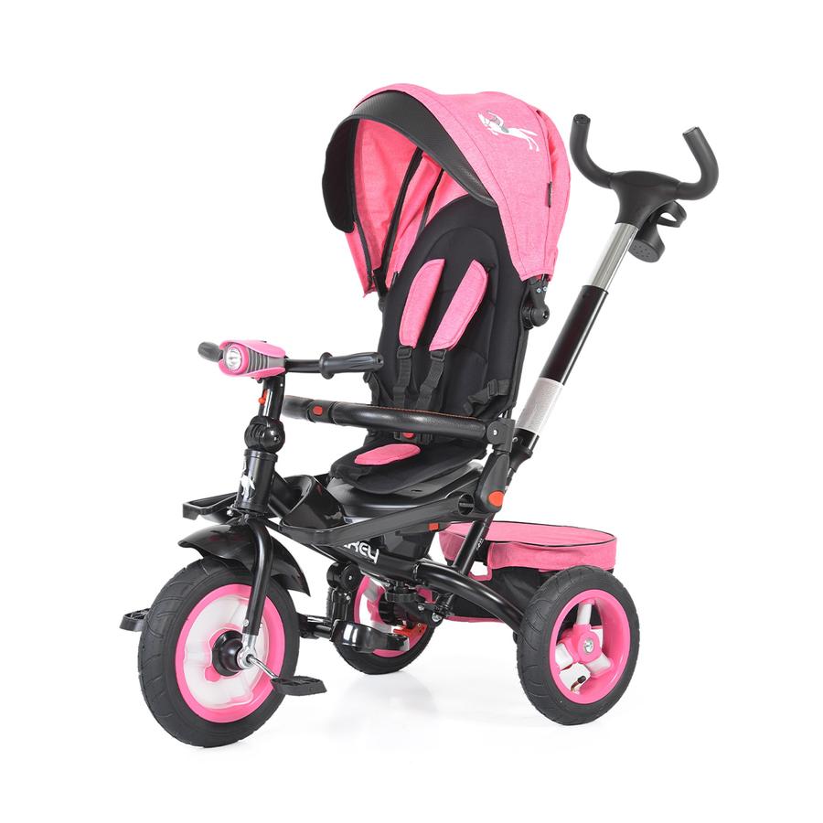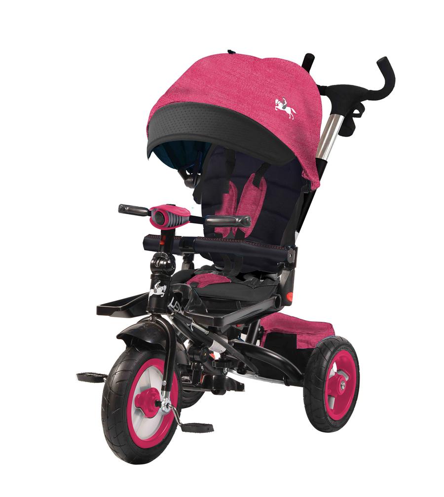 За деца на възраст от 12 до 72 месеца и с максимално тегло до 28 кг; Надуваеми гуми - предна 12 инчова, задни - 10 инчови; Предно колело с функция за фиксиране на педалите - колелото се движи свободно, а педалите са в едно положение и не могат да контролират колелото. Регулируема дръжка за родителски контрол, контролираща посоката на движение на предното колело. Регулируемо кормило; Две поставки за крачетата: за по-малки деца и сгъваема за по-големи деца. Регулируем сенник; Въртяща се на 360° седалка; Облегалка - с 2 положения на лягане; Мек предпазен борд, мека сваляема подложка седалка, пет-точкови предпазни колани, две задни спирачки и задна кошница за играчки, музикално табло със светлини.