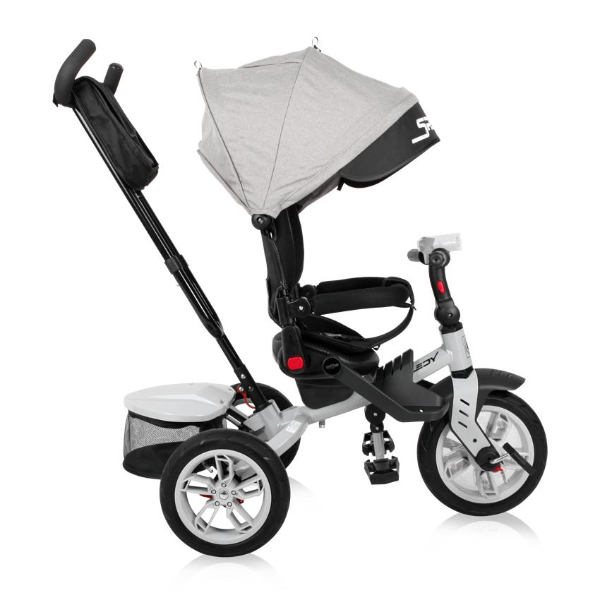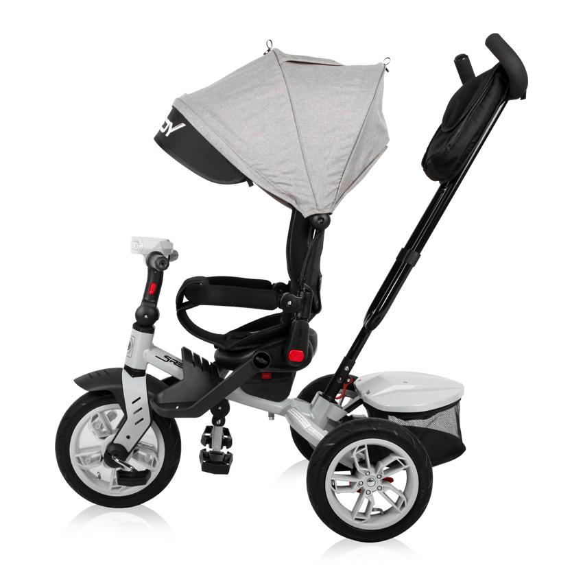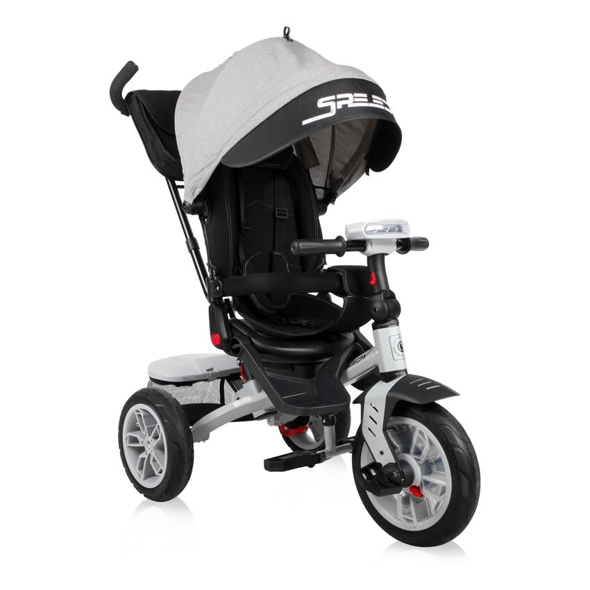 позиция: с гръб към родителя,позиция: с лице към родителя,позиция: родителски контрол,триколка,регулируема и комфортна облегалка,сгъваем сенник с 2 секции, прозорче с капак и козирка с възможност за сваляне посредством цип,преден панел - фар с музика и светлина,чанта,подвижен гриф с бутон за закопчаване,сгъваема поставка за крачета,бутон за стопиране движението на педалите на предното колело,текстилен багажник с пластмасов капак,подвижна поставка за крачета за по-малки деца,бутон за регулация на кормилото,бутон за завъртане на седалката – ротация на 360º,индивидуални спирачки на задните колела,3-точкови предпазни колани,2 степени на регулация на родителската дръжка,отстраняема тапицерия за лесно почистване,въздушни гуми – 12 и 10 инча,дъждобран за триколка /не е включен/
