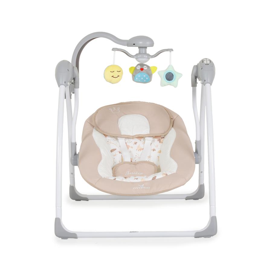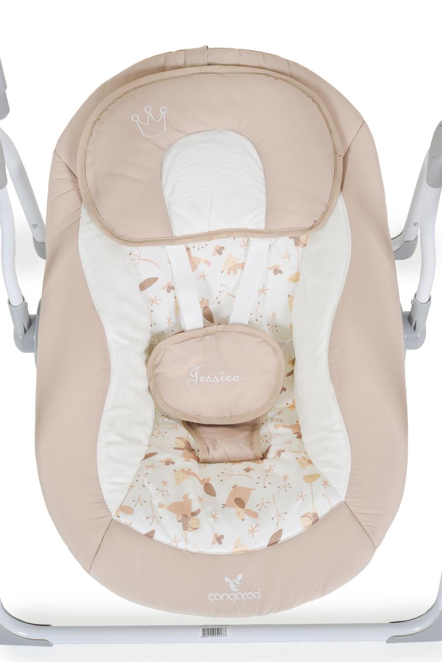 Седалката има две позиции - легнала за почивка и полуизправена за игра. Детската люлка работи с адаптер или с батерии.