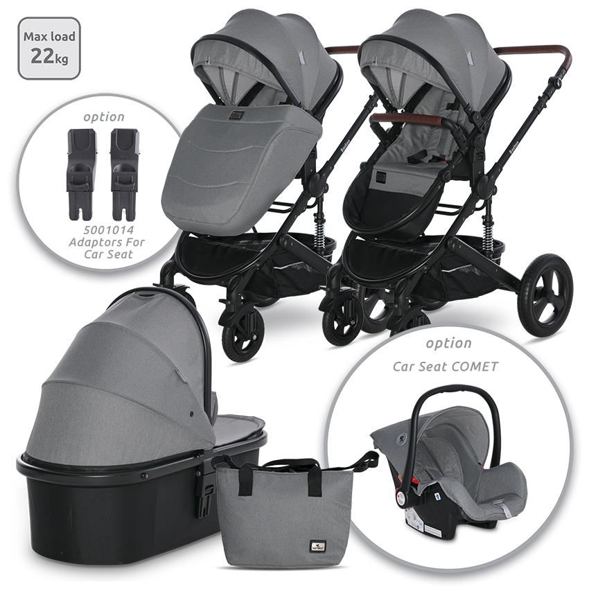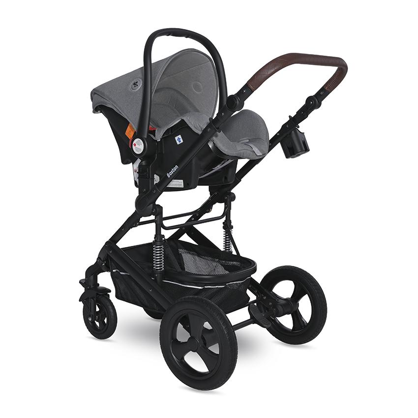 амортисьори,кош за новородено,покривало за крачета,сгъваем сенник,чанта за аксесоари,подвижна поставка за крачета,голям кош за пазаруване,завиващи предни колела,реверсивна седалка,регулиране на дръжката,поставка за аксесоари на дръжката,столче за кола /опция/,заключващ механизъм,5 точкови предпазни колани,мрежа против комари,сгъваема до компактни размери,спирачка на задните колела,алуминиева рама,регулируема облегалка,гриф: ЕКО кожа,дръжка: ЕКО кожа,Кош за новородено: покривало,Столче за кола: ергономична дръжка за носене,Столче за кола: мека подложка за тялото