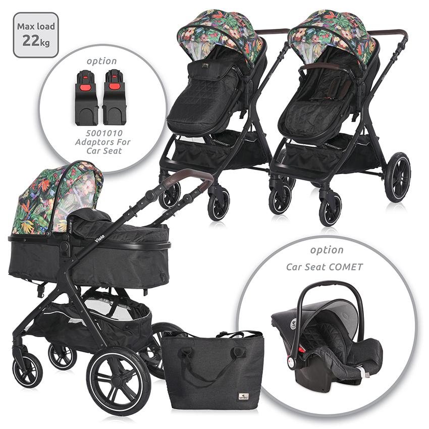 чанта за аксесоари,сгъваем сенник с козирка,поставка за аксесоари на дръжката,отстраняем гриф,столче за кола /опция/,завиващи предни колела,кош за новородено, трансформиращ се в седалка,мека подложка за тялото,спирачка на задните колела,покривало,реверсивна седалка,регулиране на дръжката,5-точков предпазен колан,голям кош за пазаруване,гриф: ЕКО кожа,дръжка: ЕКО кожа,сгъваема до компактни размери заедно с трансформиращия се кош,*опция за монтаж на столче за кола COMET чрез адаптори 5001010 /адапторите не са включени в комплекта/