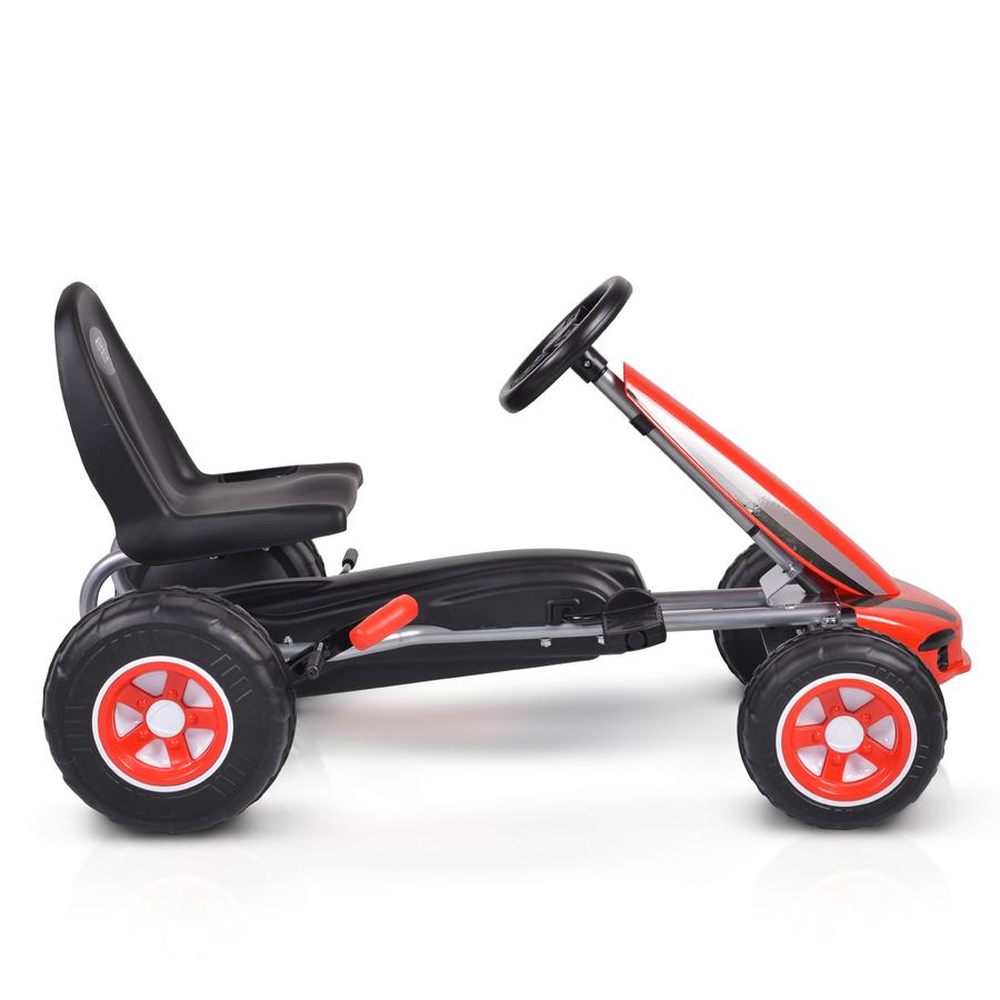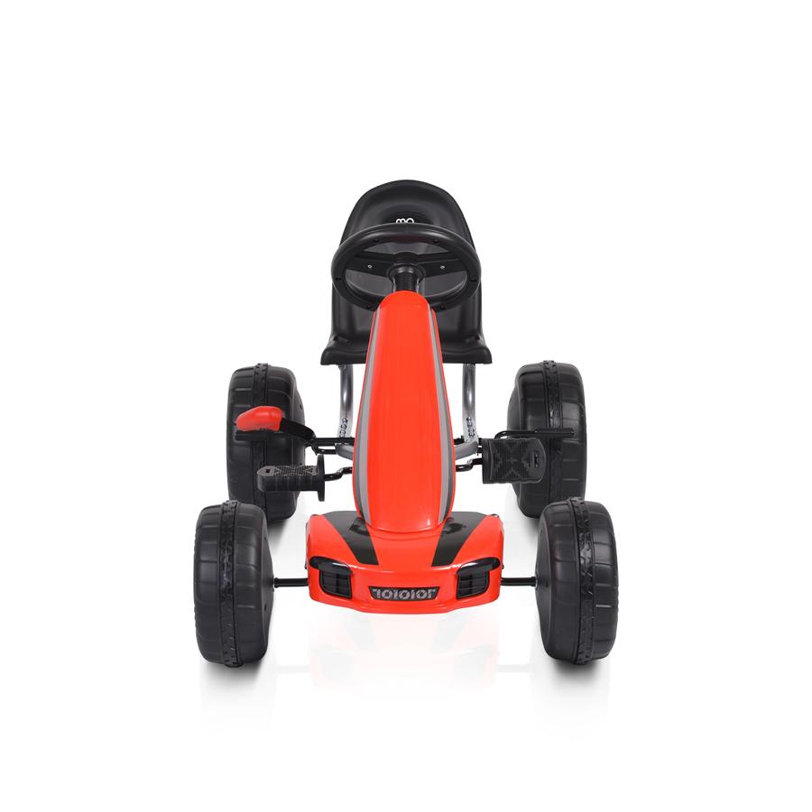 Подходящ за деца на възраст над 36 месеца с максимално тегло до 30 кг. Колата се движи напред и назад чрез педалите. Картингът е със задна спирачка и пластмасови гуми.