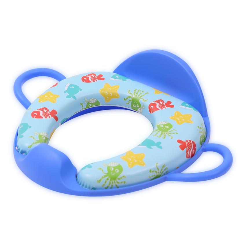 мека и удобна тоалетна седалка за деца,лесна за пренасяне,отделяща се мека възглавничка за лесно почистване,практични странични дръжки за хващане,пластмасов протектор за предпазване от измокряне,пластмасова комфортна облегалка